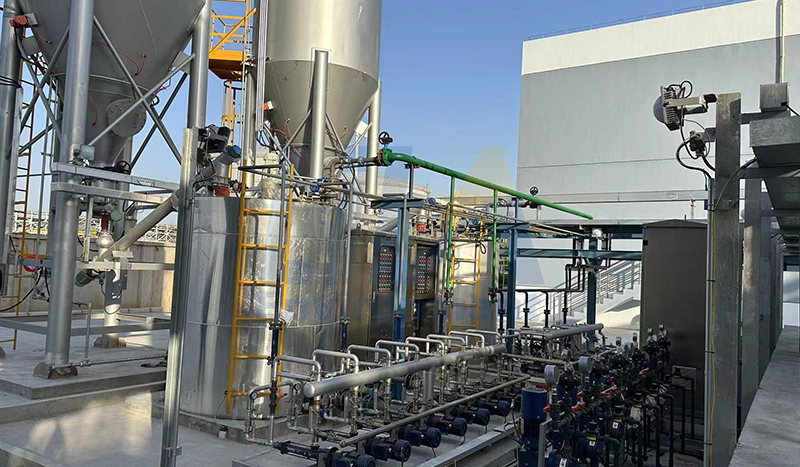 筒仓内储存的干化学品由振动仓顶卸料器、星型卸料器、螺旋输送机输送至配药罐中,同时进水电磁阀和配药罐搅拌机打开,将干粉配置成一定浓度的药液。